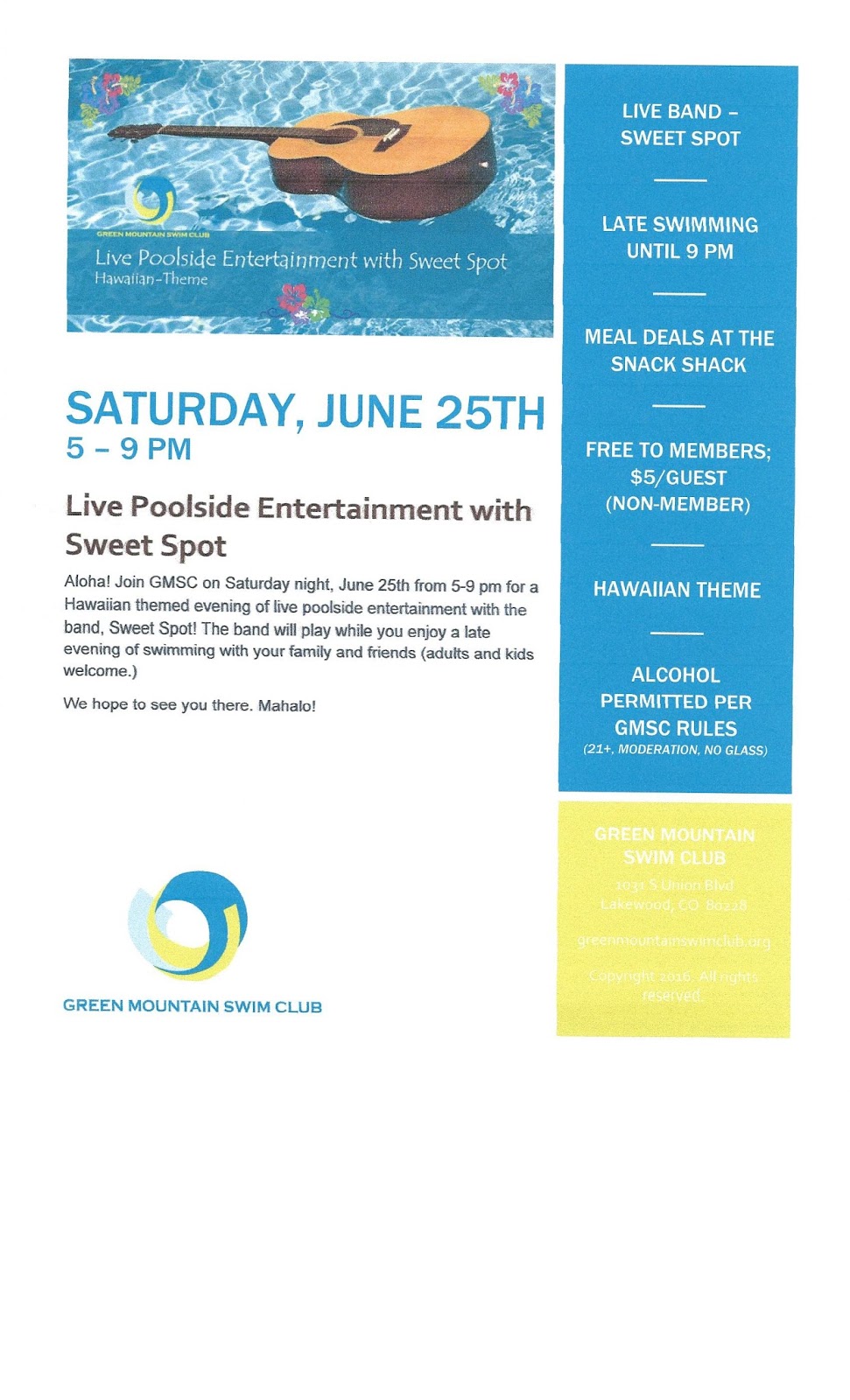 Join GMSC on Saturday night, June 25th from 5-9 pm for a Hawaiian themed evening of live poolside entertainment with the band, Sweet Spot! The band will play while you enjoy a late evening of swimming with your family and friends (adults and kids welcome.)