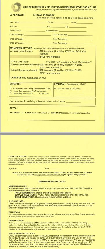 Are you looking to renew your membership at the Green Mountain Swim Club next year? If you are, don’t miss out on the opportunity to save $50 and renew at a rate of $425 if you pay in full by January 2, 2018. Refer to the attached membership letter and 2018 membership application for more details.